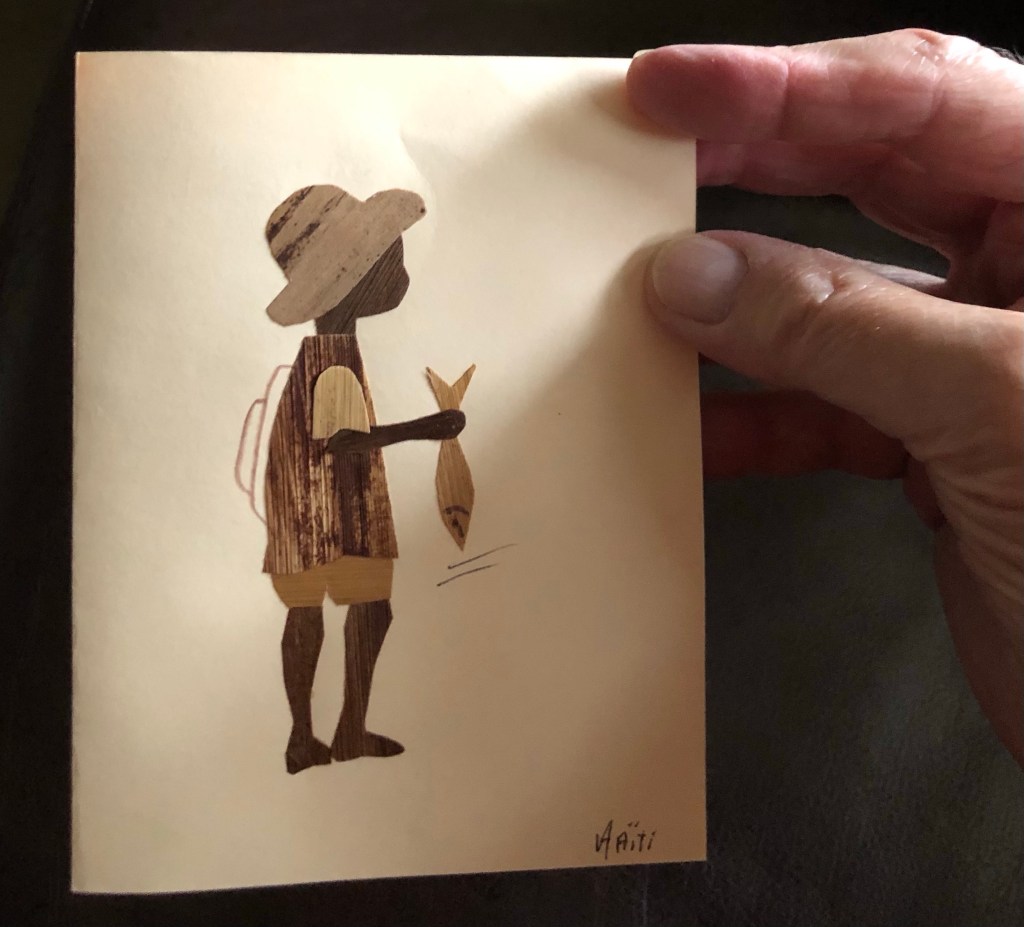 On the day of the team’s departure, a villager named Toussaint approached Elizabeth with a paper bag. He was a self-taught artist and created illustrated greeting cards. Using thin slices of coconut bark he crafted scenes of village life. He told her they were a gift to her. She could keep them or sell them. Any monies collected could be used for food or clothing. The cards were beautiful and manifested innate talent.