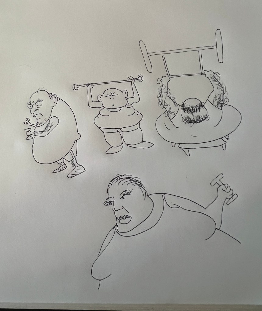 The clientele had changed in physical appearance – tattoos were flaunted on both sexes and all ages. People were transfixed with their cell phones, AirPods were de rigueur, and self-absorption in the weight room was often on display. There were many papagallos, male and female, grunting and preening in front of ten foot tall wall mirrors. The yells sometimes resembled kidney stone attacks.